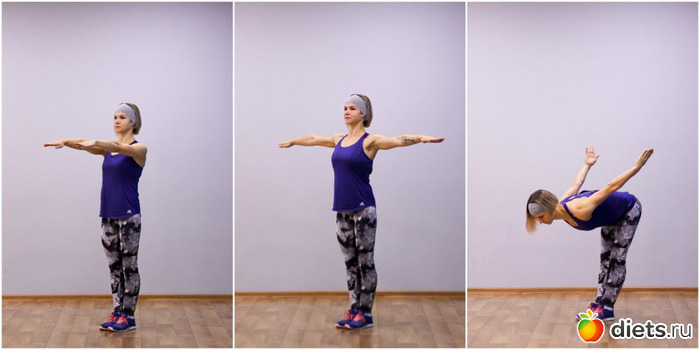 На выдохе сделайте наклон, руки заведите за спину и поднимите. Голова поднята, взгляд направлен вперёд.