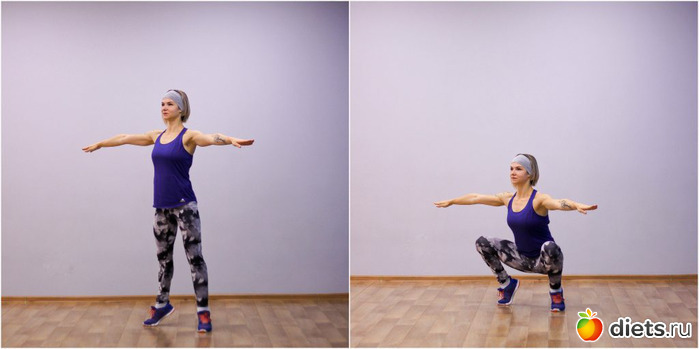 Продолжая вдох, опуститесь в приседание.