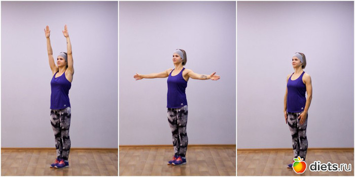 Встаньте прямо, ноги на ширине плеч, прямые руки поднимите в стороны на уровень плеч.