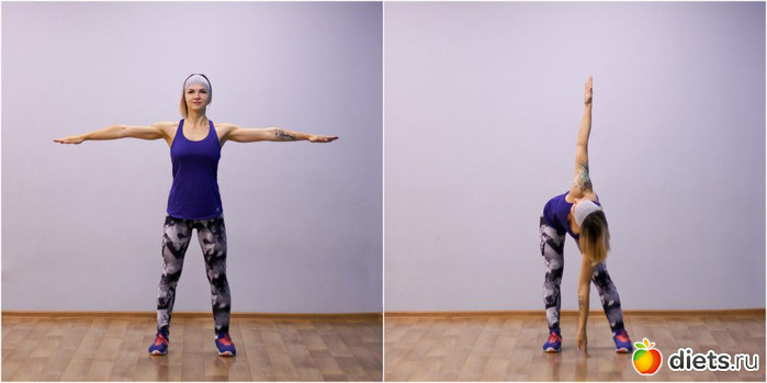 Упражнение 4. Глубокий наклон в сторонуРазвивает мышцы плеч и талии, стимулирует печень и кишечник.