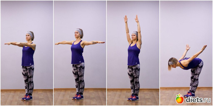 Медленно выпрямляйтесь, разворачивая руки в исходное положение.