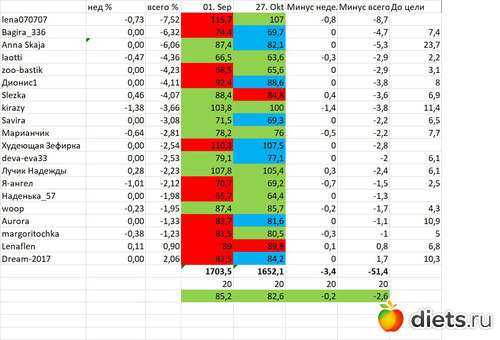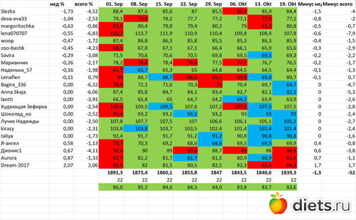 Шоколад_ко сама покинула группу. taliya не отчиталась 3 раза подряд. Так что нас осталось 20 человек. Наш начальный вес 1703,5 кг. А теперь 1652,1 кг. Т.е. 51,4 кг чистого отвеса!