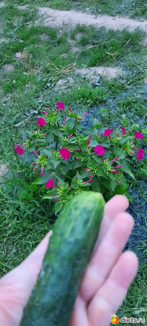 Огурчик ещё не дачный, но на фоне нами посаженных цветочков.