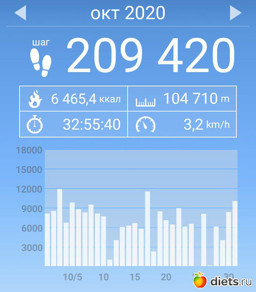 1 час бега вечером - 10 т.ш, 1 ч быстрой ходьбы утром - 8 т.ш., днем топтание по дому, в магазины... В выходные плюс длинная прогулка в город подальше 8 - 12 км... Вот и набирается...