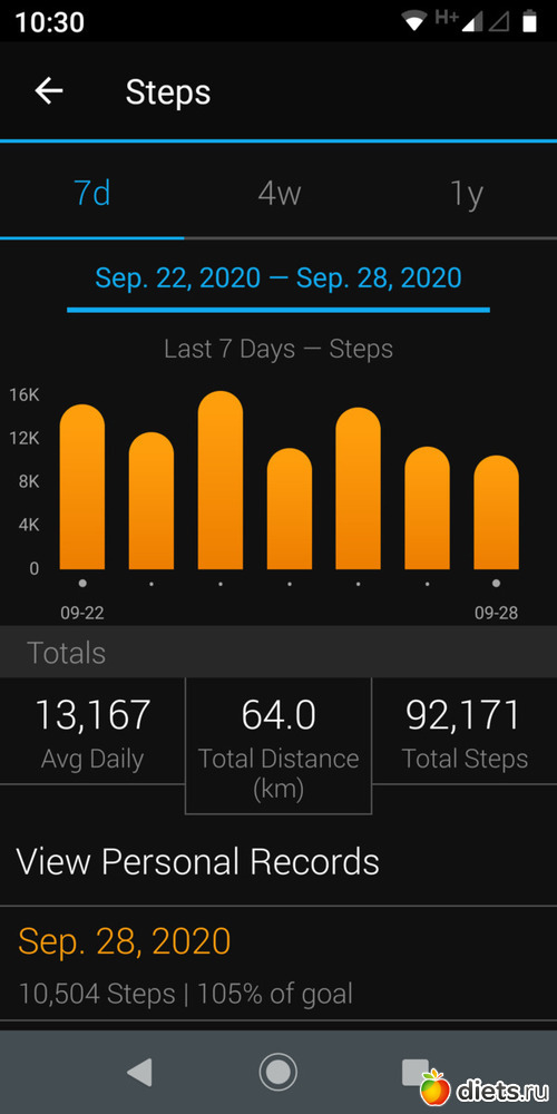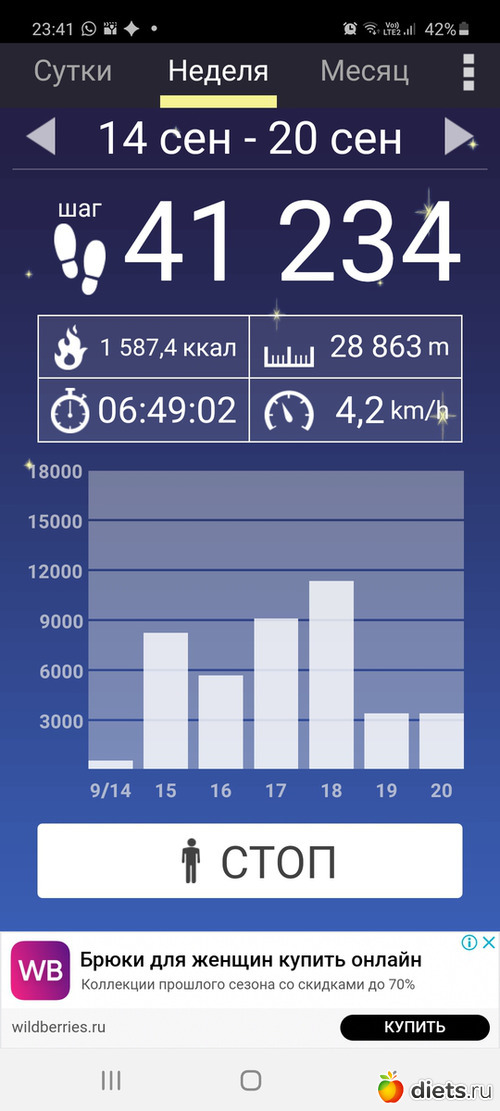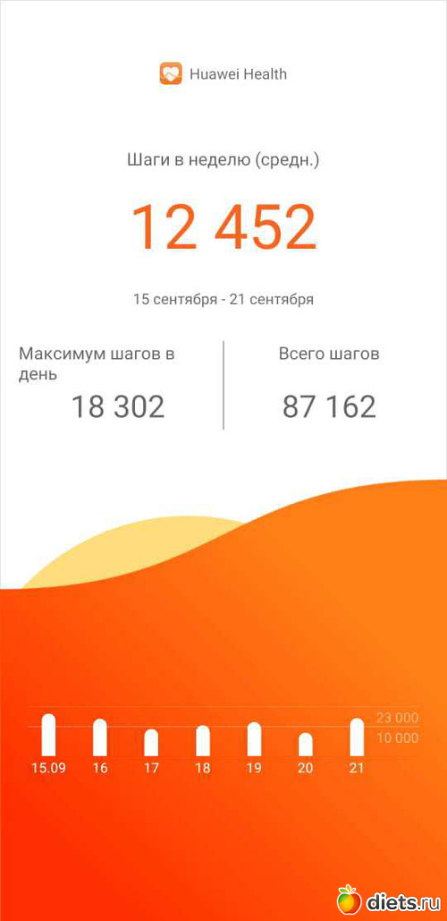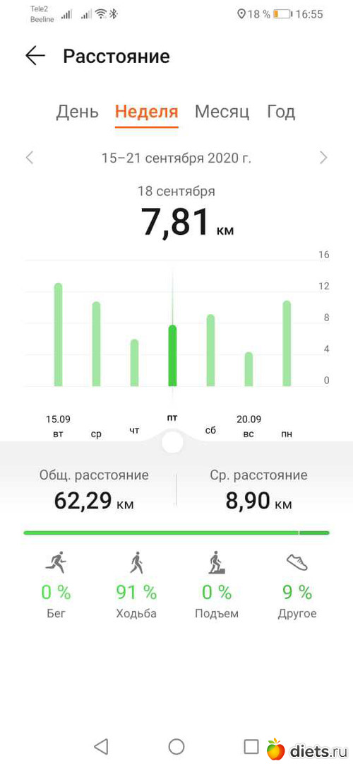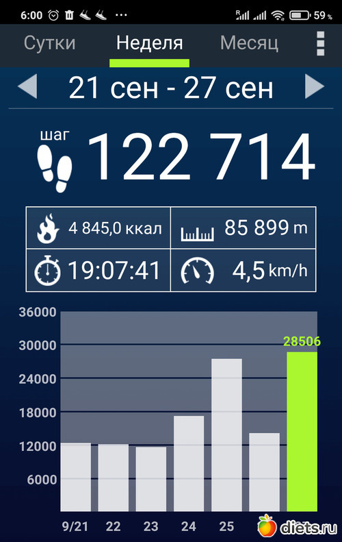 На этой неделе мало нашагала, всего 87162 шагов, 62,29 км