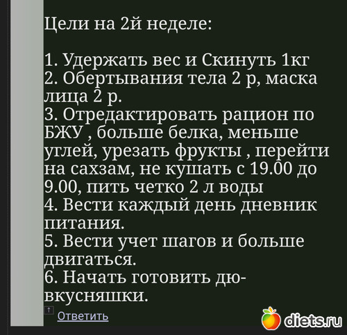 Цель на следующую неделю:не болеть, не пропустить тренировки,придерживаться питания. Мне очень хорошо подошел принцип интервального голодания.