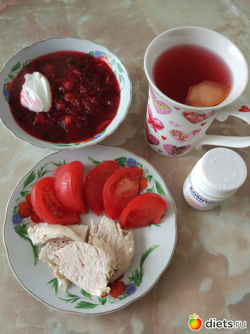 Обед: суп с гречкой, куриная грудка отварная, салат из с овощей, компот