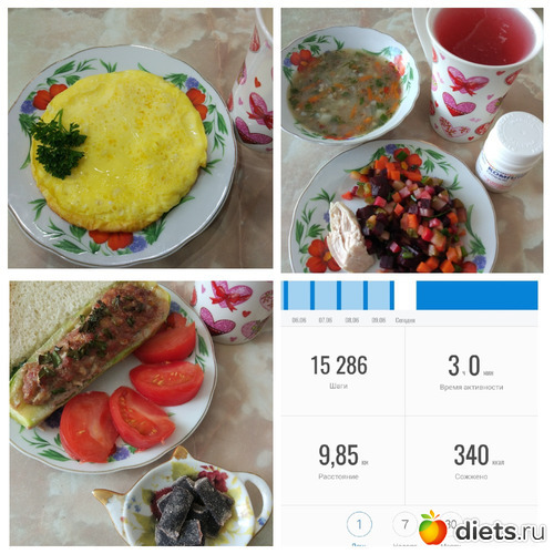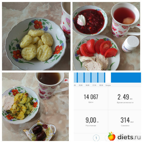 На завтрак два бутера с сыром, кофе с молоком много 4 чашки, перекус 5 фиников, 3 маленькие нектарина, 10 МДМ с орешков, обед суп куриный, 100 мл молока и баранка.