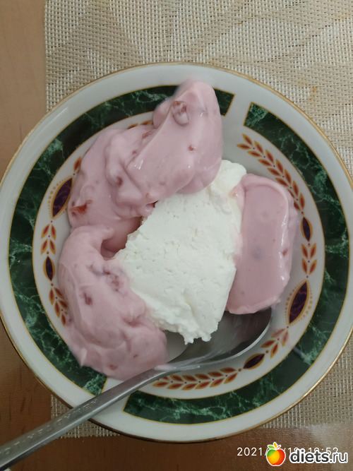 Сегодня поздний приход домой, поэтому творог и немного вишнёвого йогурта, т.к. кто забыл достать ягоду из морозилку утром