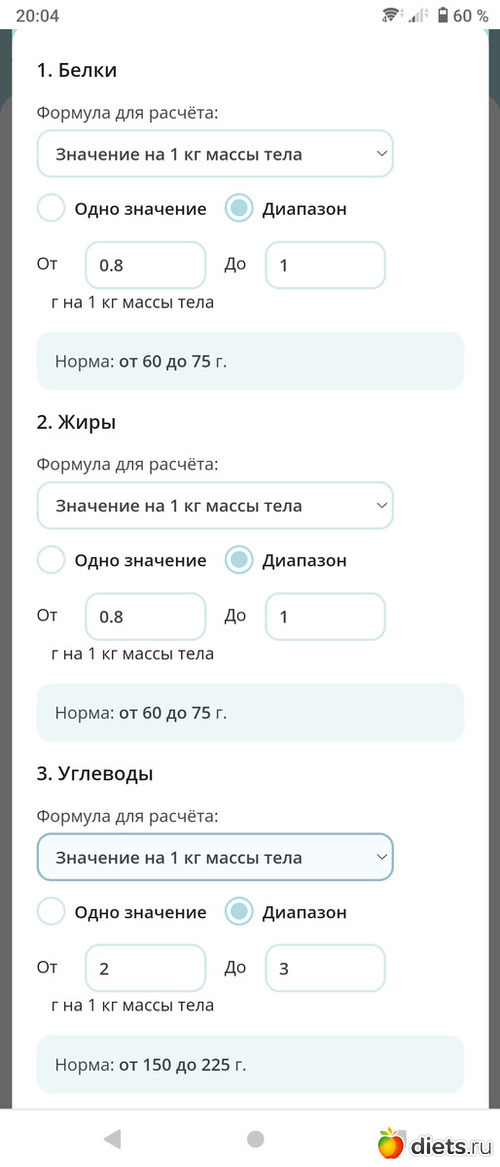 И по БЖУ указала, что хочу питаться по 0,8-1 гр белка и жиров и 2-3 гр углеводов на условные 75 кг (хрестоматийные 4 гр углеводов я просто не съем).