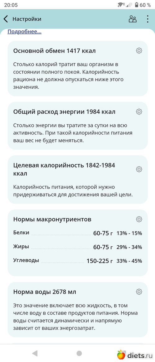 Сначала, наверное, про настройки напишу. На ЗОЖнике несколько готовых вариантов по КБЖУ, но никакой не подошёл при ближайшем рассмотрении.