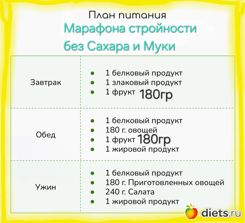 И по поводу питания,я думала что питание у нас на выбор,кто-то питается по предложенному списку,а кто-то на своём меню...Ведь основа марафона-Минус сладкое и мучное?