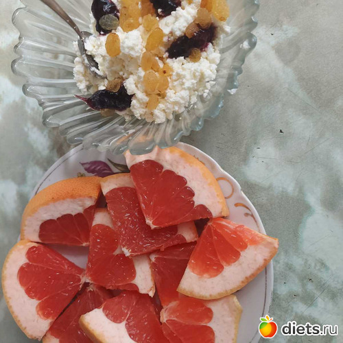 Мой любимый завтрак : творог с изюмом , чуть смородиного джема , грейпфрут