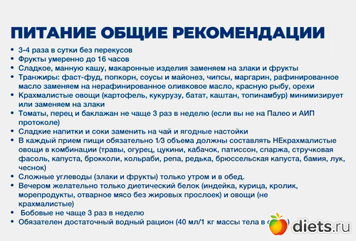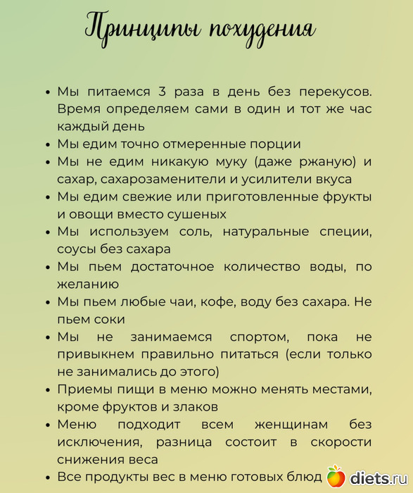 Главное поняла: еда 3 раза в день, не есть ничего с сахаром и мучного.