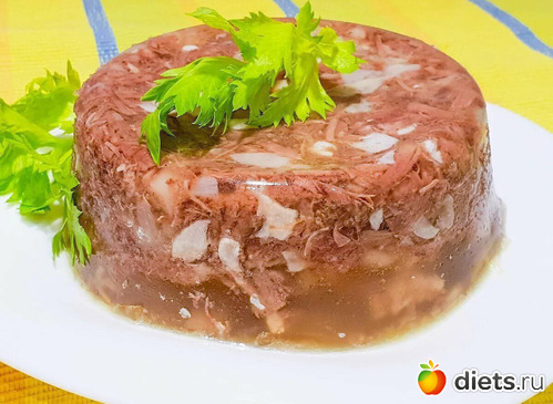 О - заливное(холодец) мясо кур.грудки-100г+желе из бульона 150г + салат огурцы помидоры 180г + 2 белых нектарина