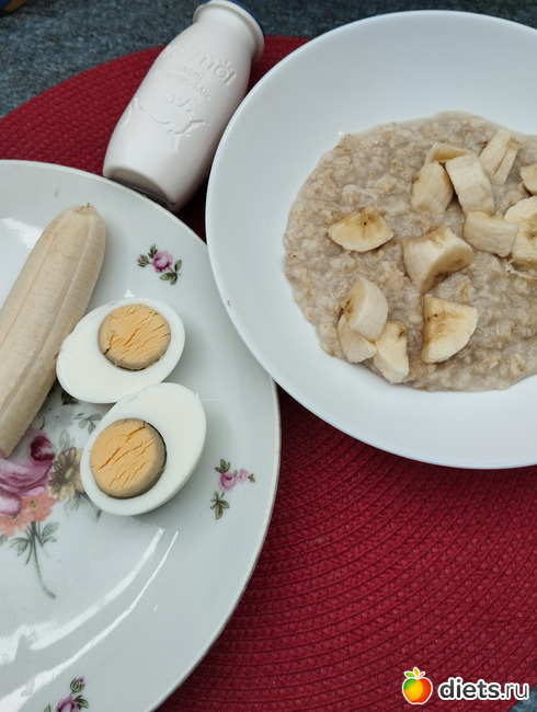 Завтрак: Овсянка на воде, яйцо, банан, актимель.