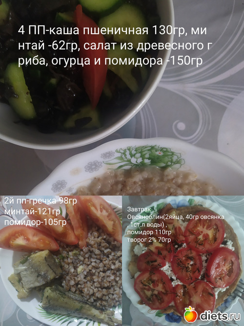 Ужин: 120 г кета, запеченная, 180 г патиссонов с луком и морковью, тушенных на 1 ст.л подсолнечного масла ,240 г салата: огурцы, помидоры, листовой салат, зелень с соевым соусом.