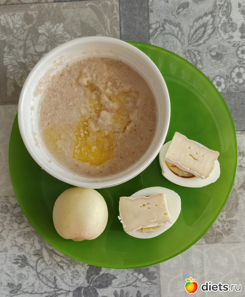 Каша-отрубяша на воде +5гр со масла, яйцо 50г и сыр камамбер 15г и еще белый нектарин 50г