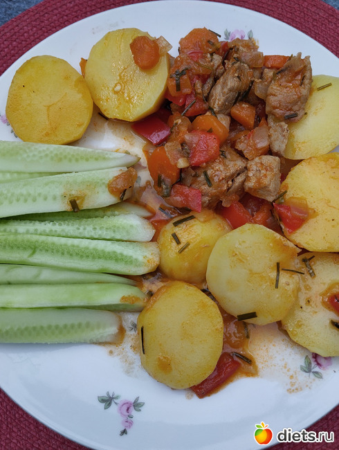 Ужин: Постная свинина с овощами, огурцы, картофель отварной