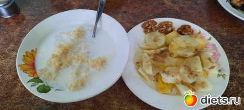 Завтрак:пшенная каша 120 г , молоко 100г, печеные яблоки (180г) и грецкий орех, капучино