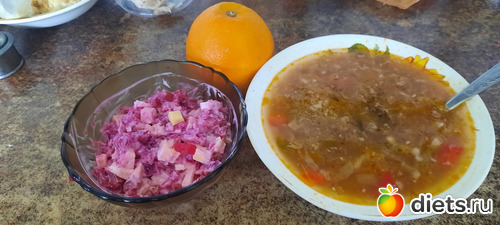 Обед - салат со свеклой (100 г), сметаной (1 ст. л) и сыром (30 г), борщ без картофеля (300г), апельсин