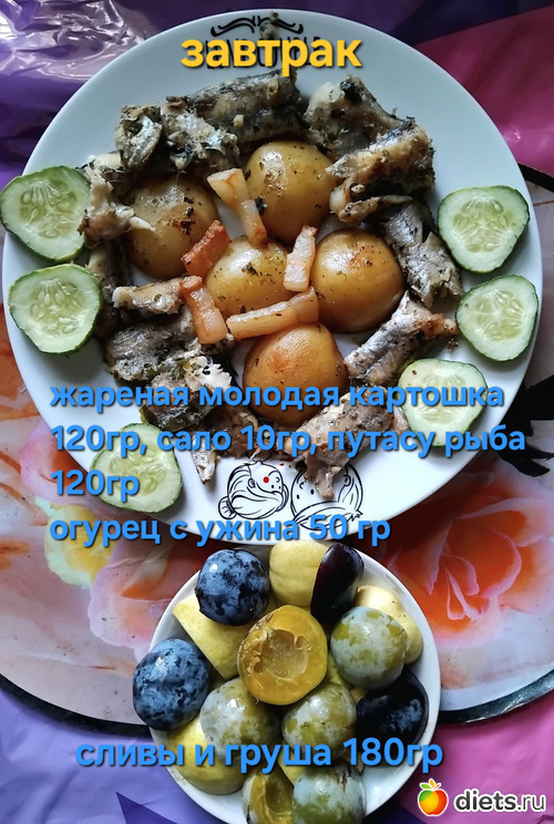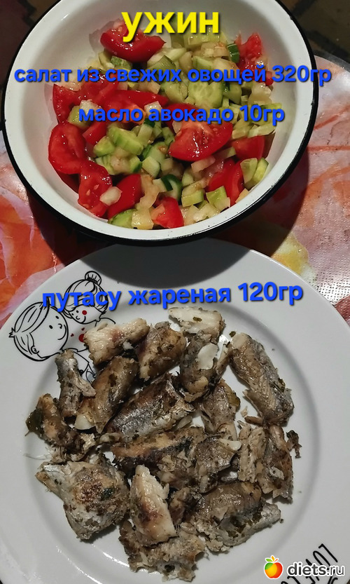Ужин - 120 г рыба, 160 г кабачки , пожаренные на 10 г подсолнечного масла, 240 г помидоры