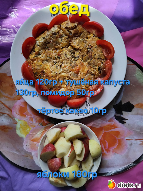 Обед - 120 г курицы отварной , 200г тушеные овощи (капуста, лук, морковь, томаты) на 10 г подсолнечного масла,