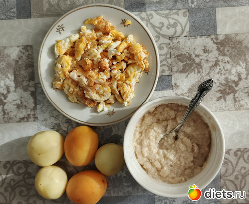 Завтрак каша отрубяша 200г+8гмасла слив, фрукты 180, яичница-болтунья(по-русски