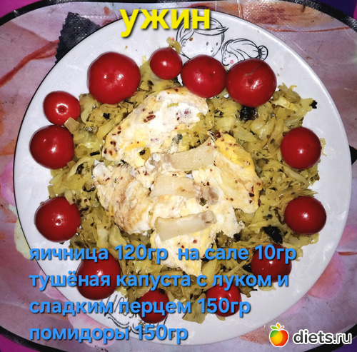 Ужин - яичница болтунья 120г с репч. луком 40г и овощи 260г