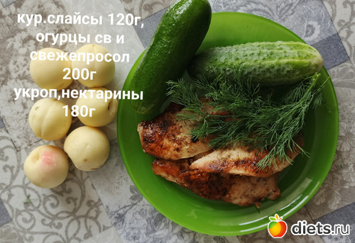 Обед - слайсы кур. 120г, овощной салат 200г и яблоки 180г
