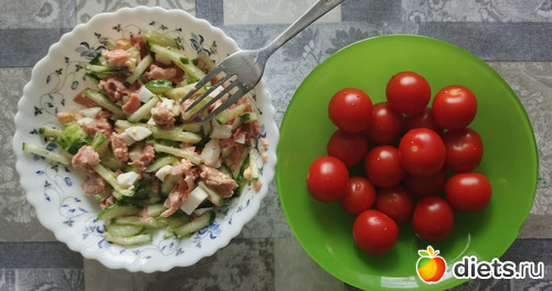 Ужин - черри 200г, а огурца в салате 100г, тунец натур б/м- 80г яйцо 40г немного соевого соуса б/сах и 10г масла раст