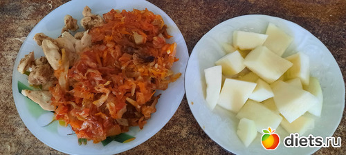 Обед - 120 г курицы отварной , 200г тушеные овощи (капуста, лук, морковь, томаты) на 10 г подсолнечного масла, 180 г дыня