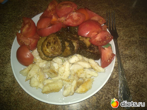 Ужин - 120 г филе минтая, 160 г кабачки , пожаренные на 10 г подсолнечного масла, 240 г помидоры