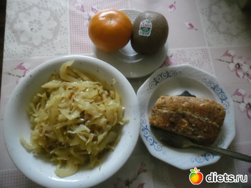 Обед: 120 г свиная отбивной без панировки, 200 г тушеные овощи (капуста, лук, морковь, томаты) на 10 г подсолнечного масла, 180 г дыня