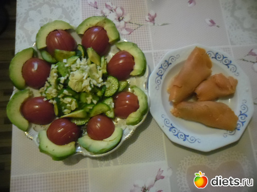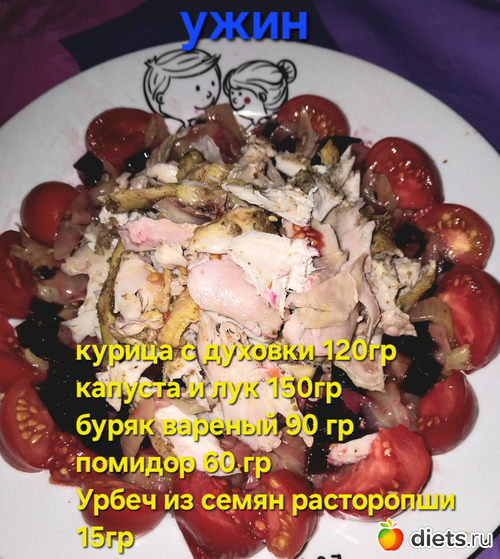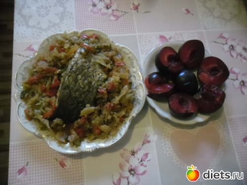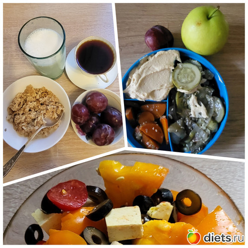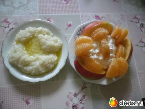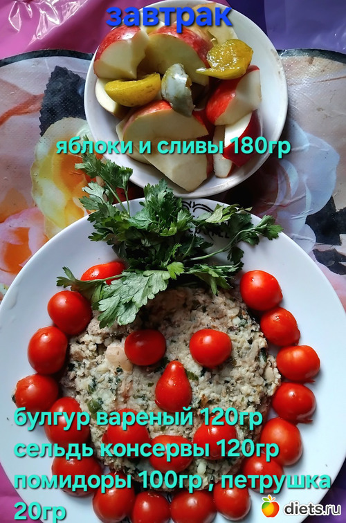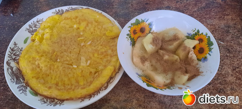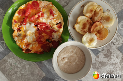 З - яичница из 2х яиц -120г с помидорами100г и с 7г раст масла +каша отрубяша без масла120г, запеченые яблоки -140г с корицей и + один нектаринчик 40г