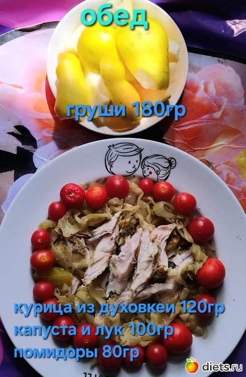 Обед: 120 г курица вареная без кожи, 200 г овощное рагу, 180 г груши
