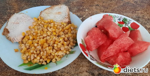 Обед: 120 г свинины постной запеченной, 200 г вареной кукурузы, 180 г арбуза. Оказывается если съесть норму белка, то 180 г арбуза еле влезает