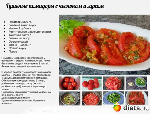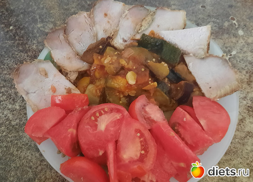 Ужин: 120 г свинины постной запеченной, 160 г овощного рагу (баклажаны, кабачки, патиссоны, морковь, лук, томаты, подсолнечное масло), 240 г помидоров свежих