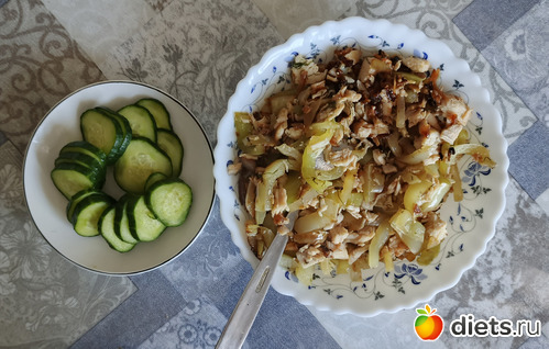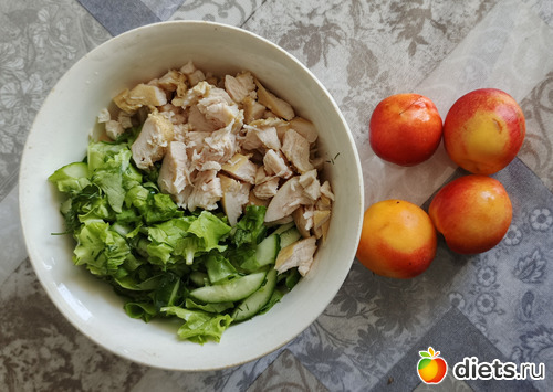 О - салат из 120г кур.филе отварн +огурцы 100г+листов.салат 20г и 8г раст. масла +нектарины узбекские 180г.