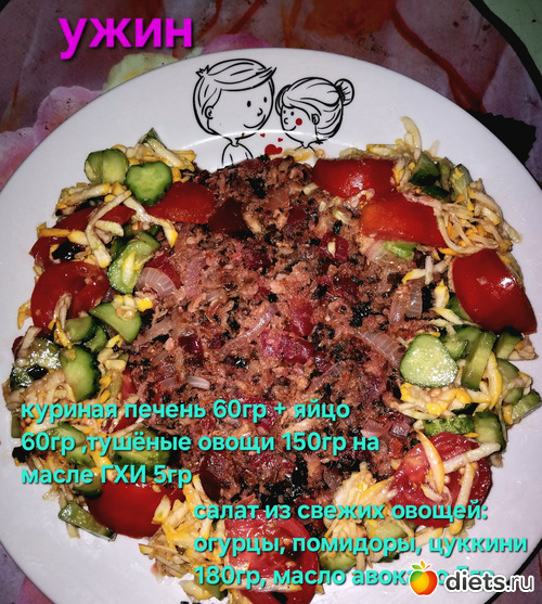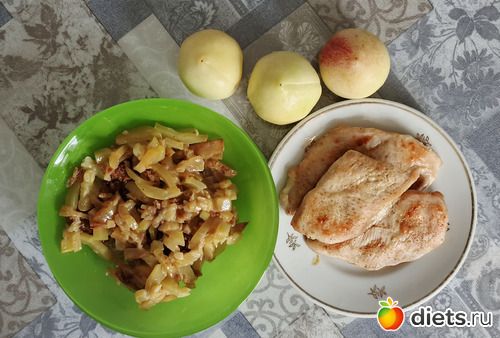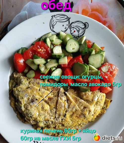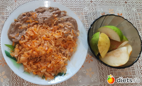 Обед: 120 г печеночного паштета (куриная печень, сливочное масло, специи), 200 г тушеной капусты(надо доедать!), 120 г груши