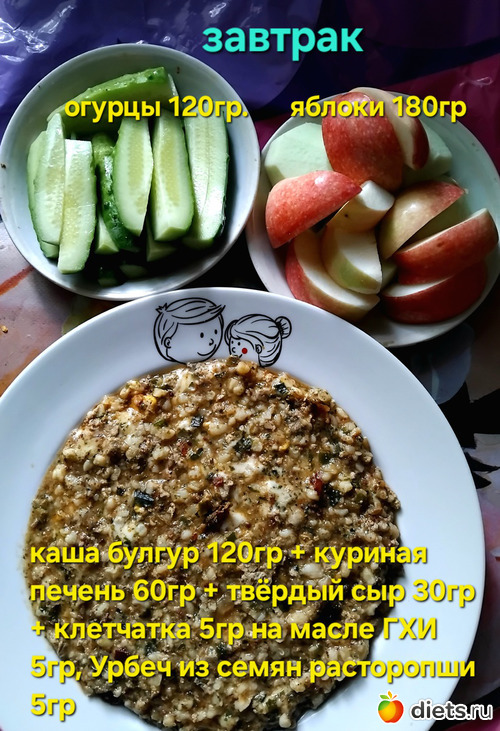 З- 120г греча+5г масла ГХИ+100г св. огурец, 150г запеканка(в ней 120г творога и 30г банана) +150г апельсин