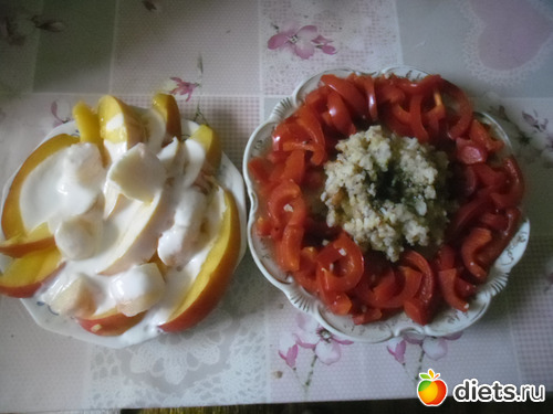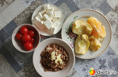 - каша-отрубяша 90г+30г греча + 5г масло ГХИ, 130г печеные яблоки+50г апельсин, 100г творожный сыр, 100г черри