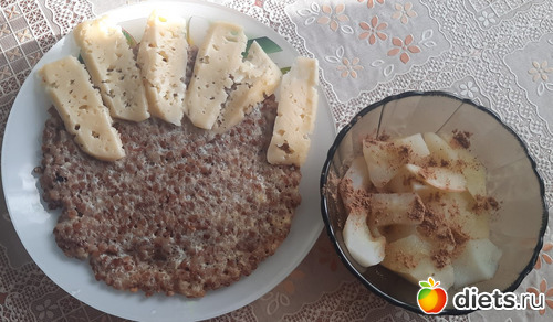 Завтрак: кашкоблин (120 г гречневой каши, 1 яйцо, 10 г сливочного масла), 30 г твердого сыра, 180 г печеных яблок с корицей.