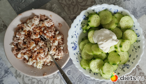 У - тунец 80г , яйца 40г, огурцы 300 +15г сметаны