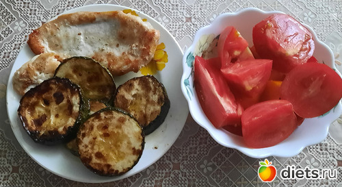 Ужин: 120 г куриная отбивная без панировки на подсолнечном масле, 160 г кабачки, жареные на том же подсолнечном масле, что и куриная отбивная, 240 г помидоров