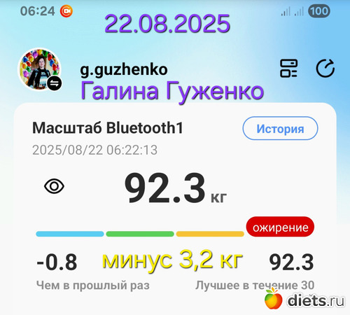 МОЙ ВЕС был на 01.08.2025 ...95,5......кг,сегодня 22.08.2025 ....92,3...кг, результат с начала марафона ( 01.08.2025 )минус ...3,2..кг хочу и СТРЕМЛЮСЬ иметь вес на 01.09.25 ...91,0....кг