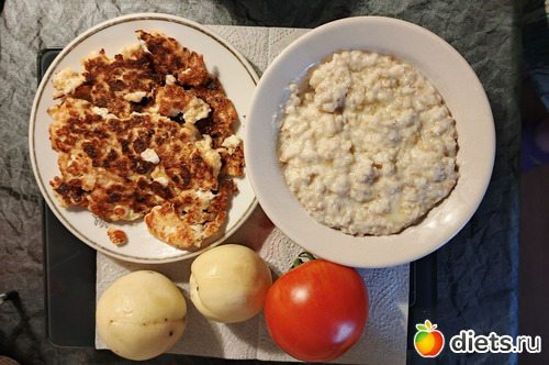 З- каша "овсянка" на воде 100г, лепешка творог 80г, яйцо 40г, 20г отруби, нектарины 180г , помидор 100г