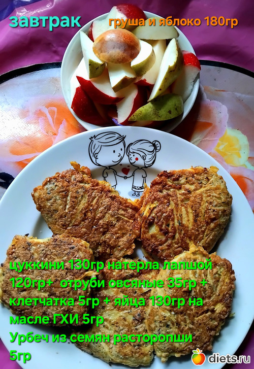 Завтрак: овсяноблин (30 г геркулес, 1 яйцо (60 г), 3 ст. ложки воды, 5 г масла ГХИ, 5 г урбеча расторопши), 30 г сыра российского, 180 г печеных яблок.