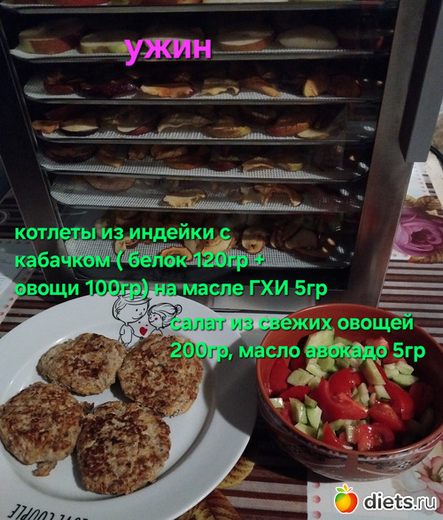 Ужин: 120 г филе минтая потушенного с луком на подсолнечном масле, 160 г кабачки на гриле, салат:120 г помидоры, 120 г огурцы,зелень, специи, соевый соус.