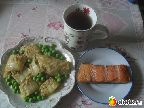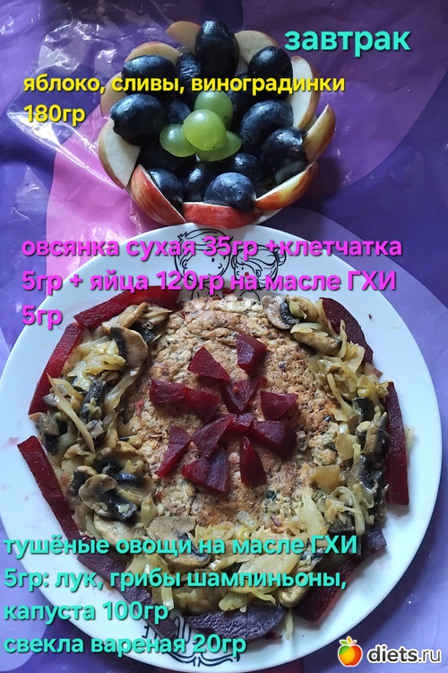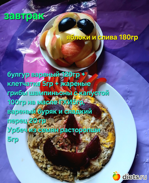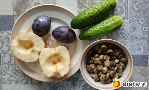 О-грибы лесные жареные 60г на 5г масла ГХИ, кур филе 60г, огурцы св. и св. просольн 200г, яблоко 70г и сливы 110г (на фото не попали)